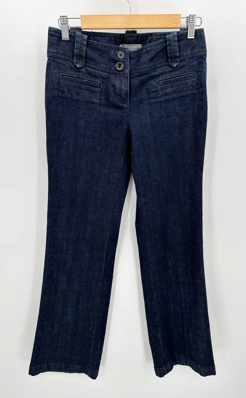 Dark wash blue denim curvy fit just below waist jeans. Button closure, belt loops, cotton blend deni... Show more