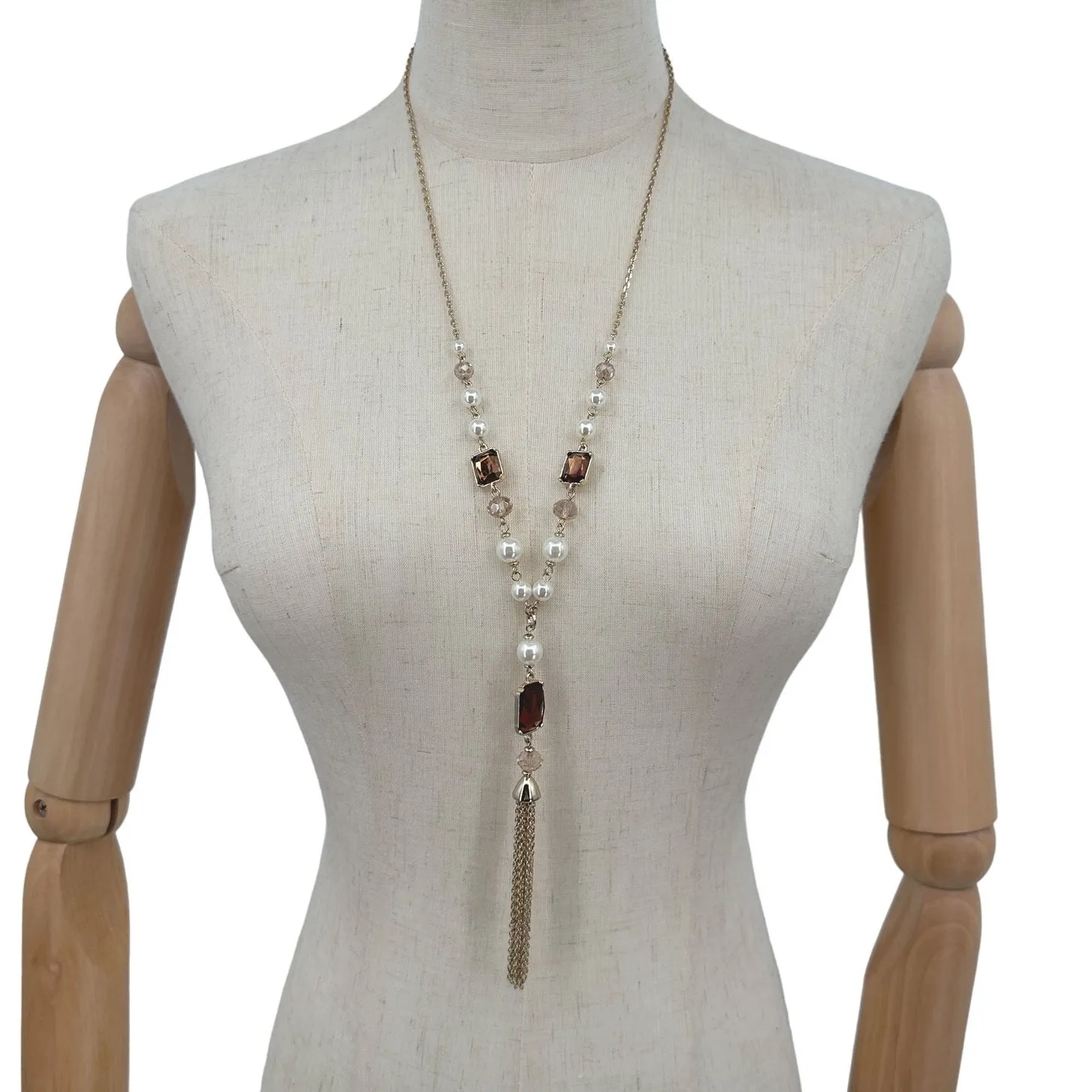 Ann Taylor Factory long "Y" style tassel necklace Shiny goldtone chain with faux pearls, brown rhine... Show more
