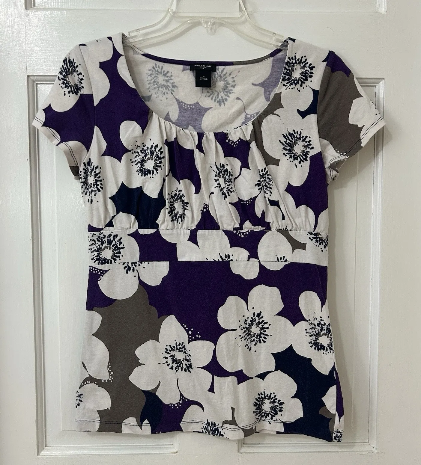 Ann Taylor Floral Knit Y2K Babydoll Top Sz M Cap Sleeve Purple, Navy, White pit to pit: 18" length f... Show more