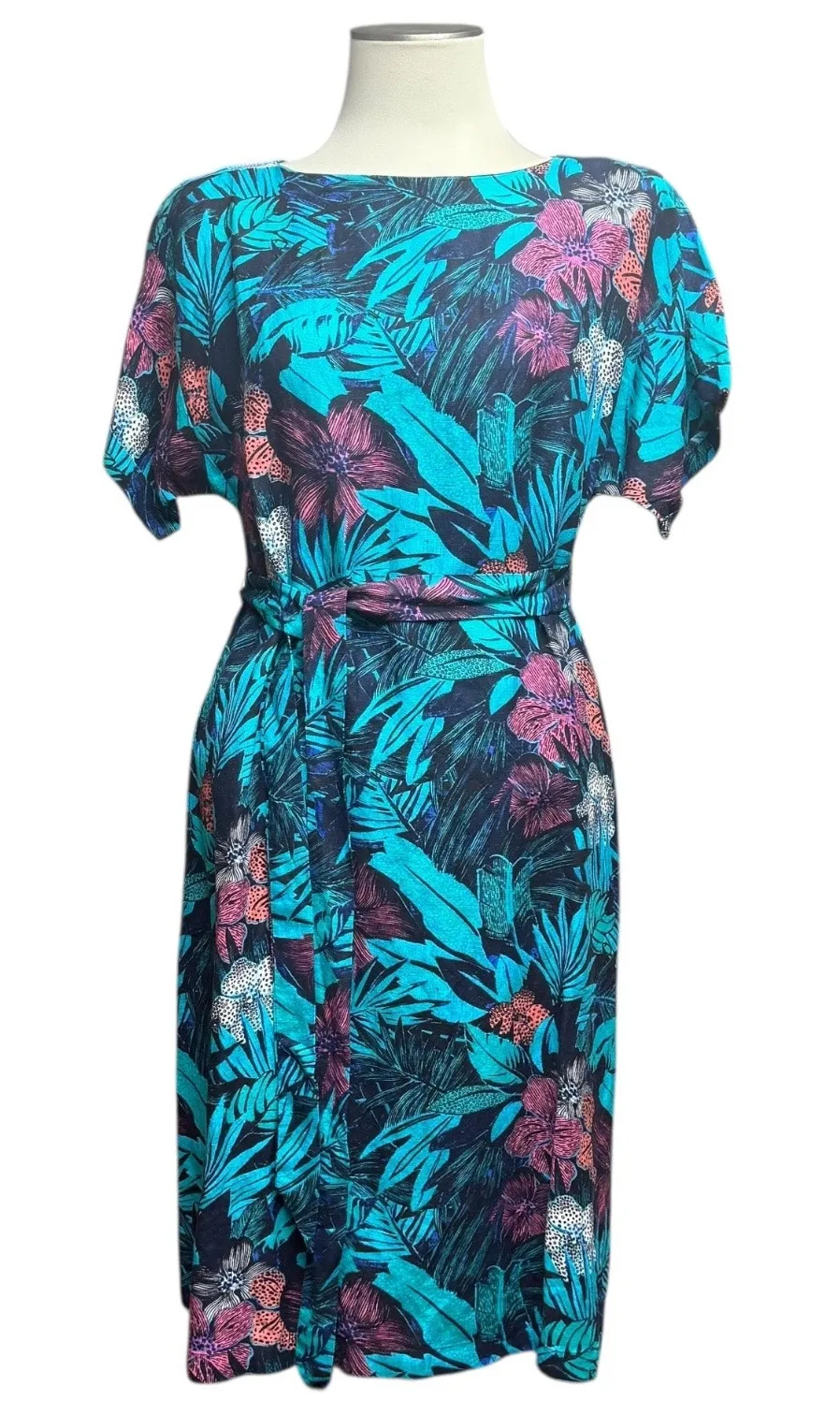 Ann Taylor Loft Linen Short Sleeve Belted Tropical Print Midi Dress Blue Green Pink Purple Small Pet... Show more