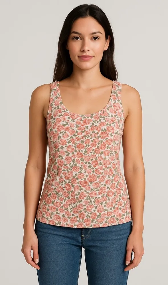 This charming LOFT floral tank top features a soft pink, coral, and green floral print on a white base. Designed with a flattering scoop neckline and wide straps, it offers an easy, feminine silhouette perfect for layering or wearing on its own. Lightweight and breathable, it’s ideal for warm weather or as a year-round layering piece.