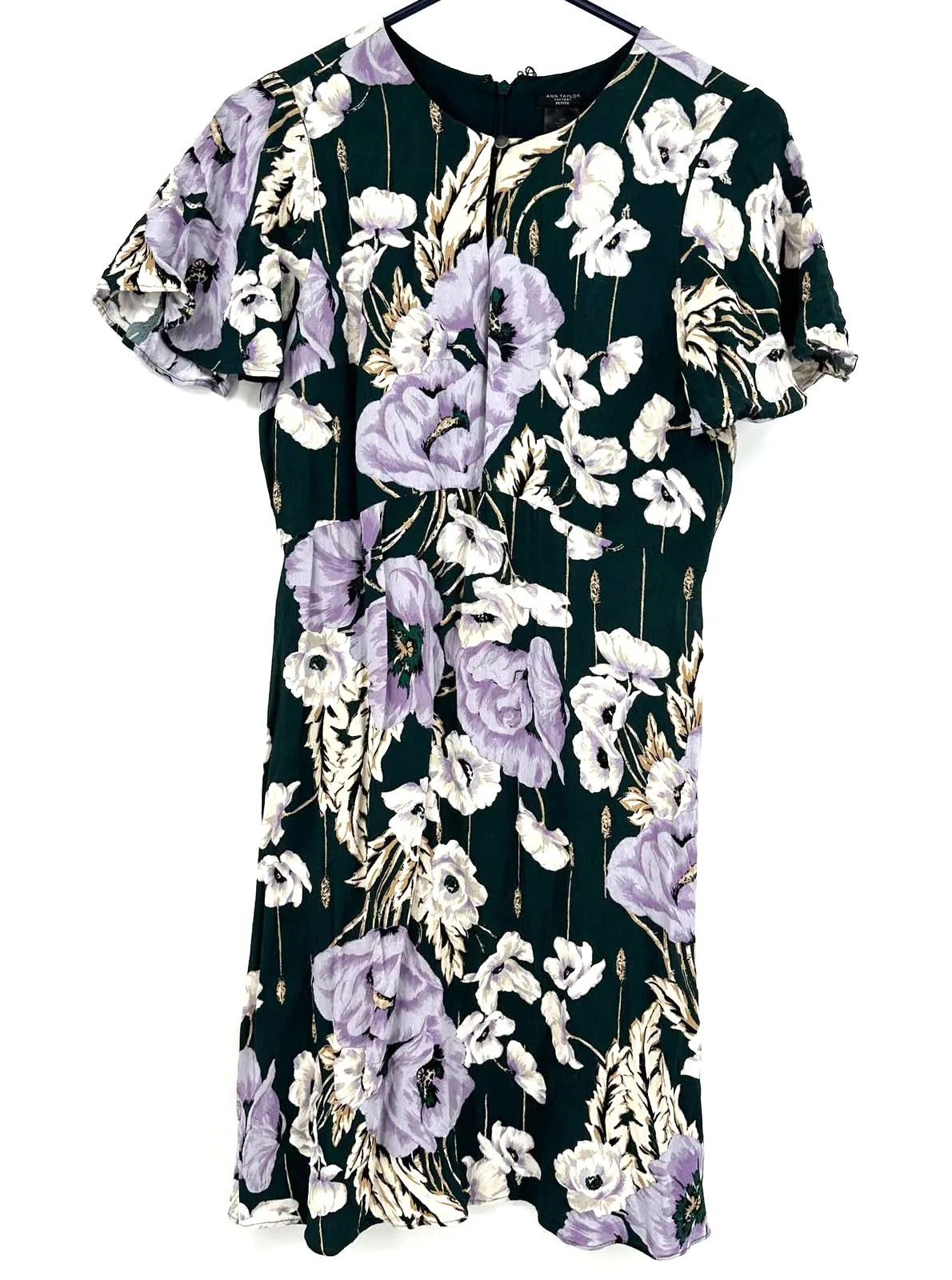 Ann Taylor size 4 petite high neckline short sleeve mini dress floral print deep teal / green with p... Show more