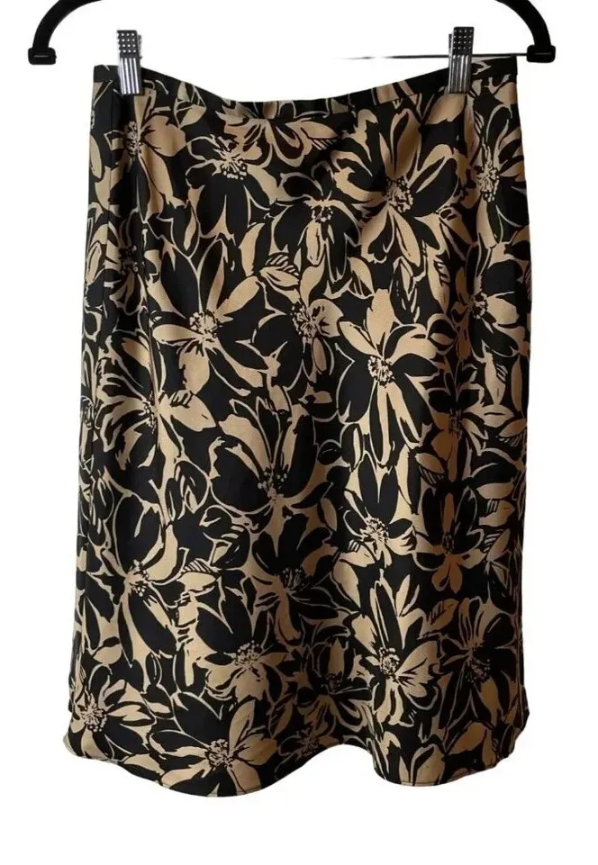 Elegant floral print midi skirt in refined brown and beige hues, suitable for professional settings... Show more