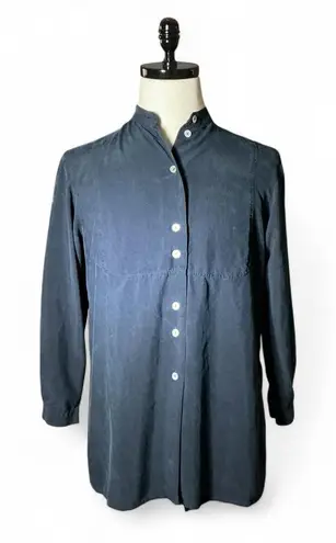 Ann Taylor silk mandarin collar button up shirt in navy blue. This long sleeve top offers a relaxed... Show more