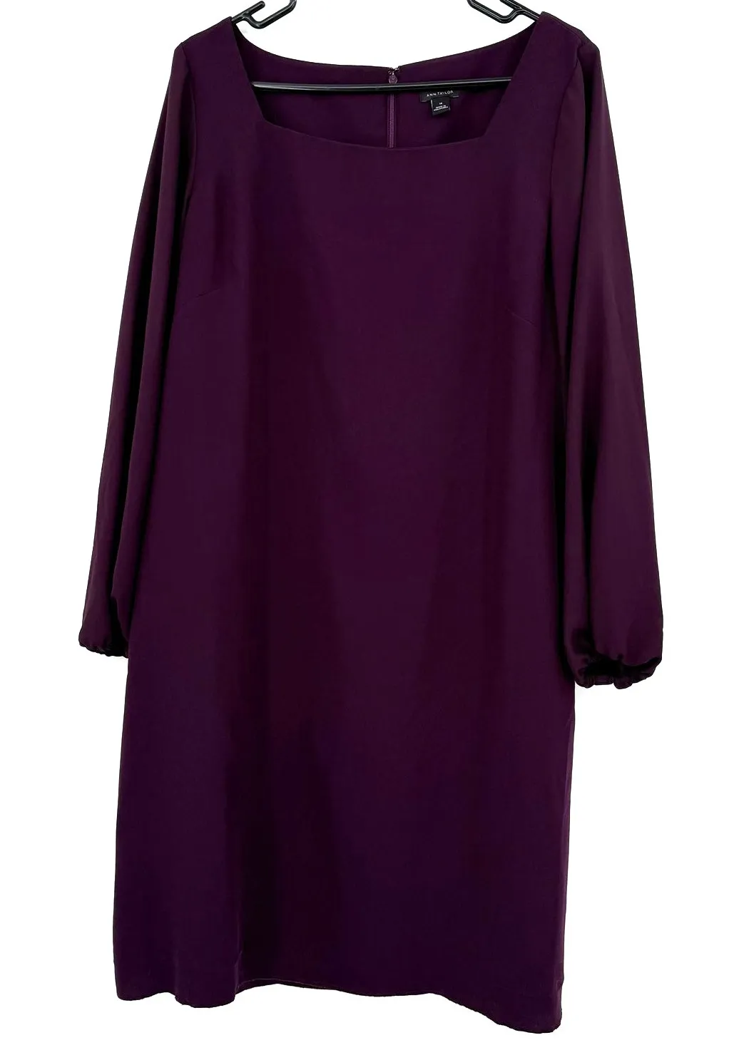 Ann Taylor Size 14 Dress Long Sleeve Knee Length Shift Style Dark Purple Zip Up Rear Banded Cuffs