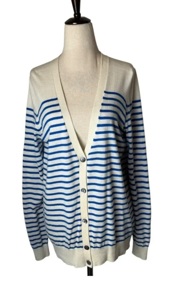 Ann Taylor Sweater Women Medium Blue White Striped Knit Button Front Cardigan Preppy