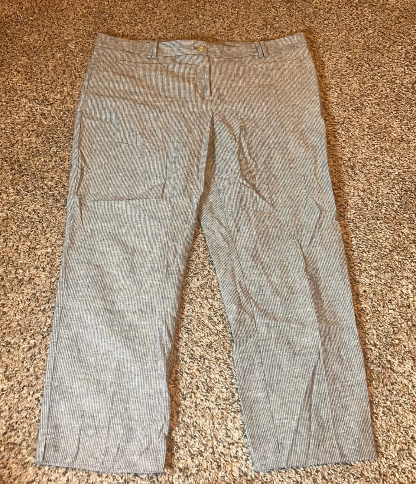 Keywords: Ann Taylor, womens trousers, size 14, gray pants, striped pants, linen blend, career pants, office wear, business casual, dress pants, work attire, classic style, professional
