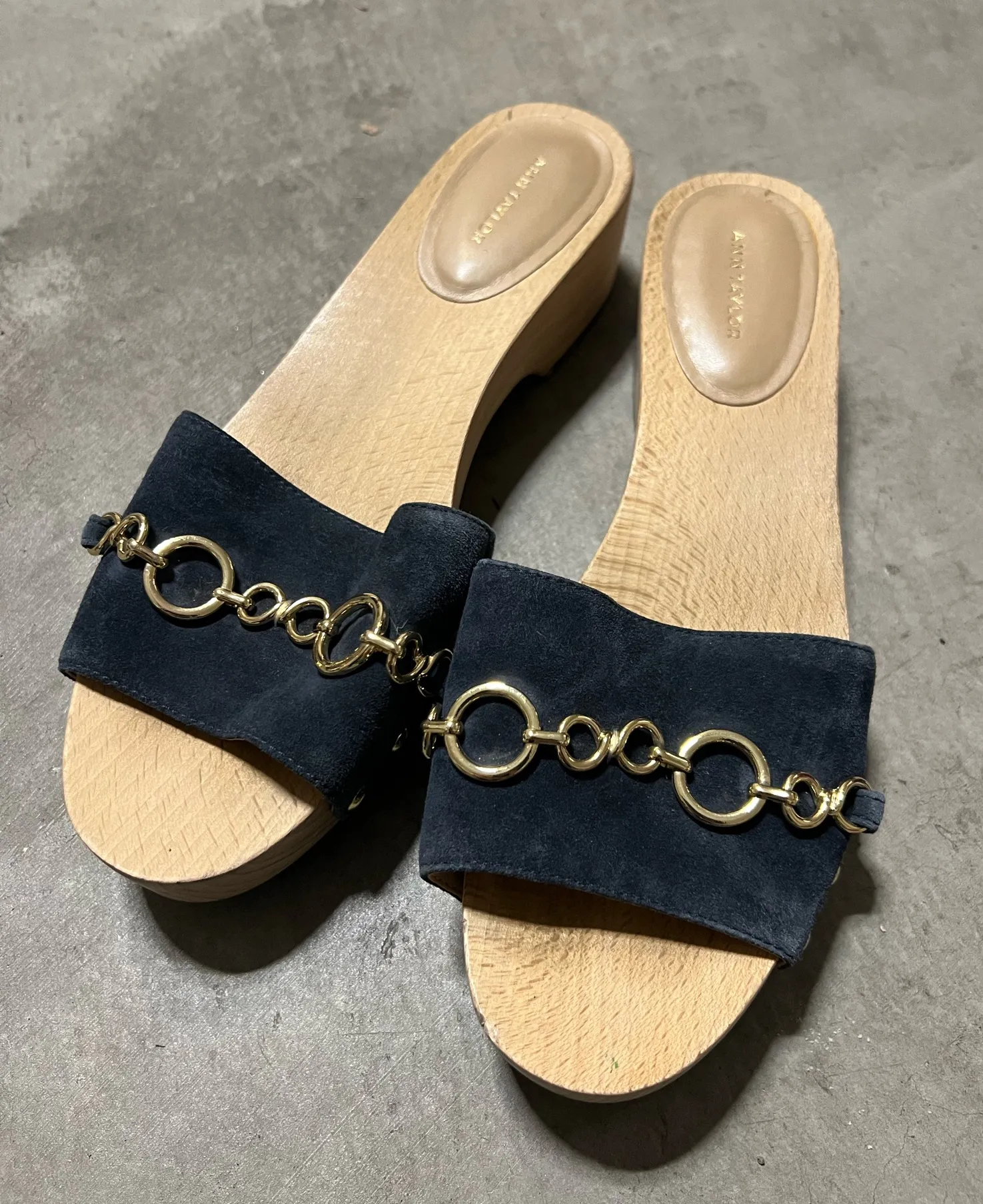 Ann Taylor Wood Navy Blue Gold Accent Wooden Clogs Mules Sandal Slipper Worn once, great condition S... Show more