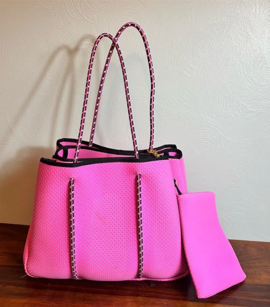 The Annabel Ingall tote in neon pink is crafted from durable neoprene and features a spacious interior with a perforated design. It includes double handles and a matching zippered pouch, making it a practical choice for everyday use or casual outings. The tote is suitable for various occasions, from shopping trips to beach days. The condition is good but with flaws; see photos for scuffs. Keywords: Annabel Ingall, tote, neoprene, neon pink, women's bag, spacious, perforated, double handles, zippered pouch, casual, everyday use, shopping, beach, durable, stylish. Brand: Annabel Ingall Exterior material: Neoprene Style: Tote Exterior color: Neon Pink Department: Women Features: Spacious interior, Perforated design, Double handles, Matching zippered pouch Smoke free, pet friendly home. May be mailed in recycled materials. See photos for best description. Most items are being sold on consignment. LS