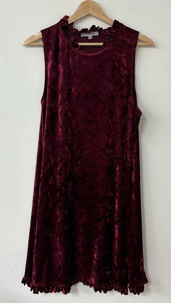 Dress is in excellent pre-loved condition with no flaws Details: crushed velvet dress with ruffled hem and ruffled neckline, polyester and spandex material, stretchy, hand wash only, made in the USA, midi length, sleeveless, pullover Measures 36” from top of shoulder to bottom and 18” across the chest Mailed from a smoke free home. Thanks for checking out my closet! I am happy to review all offers! Box 2 Tags: party dress, holiday dress, Christmas, event, cocktail party, evening dress, special occasion, cherry fever, dark feminine, whimsigoth, dark romantic