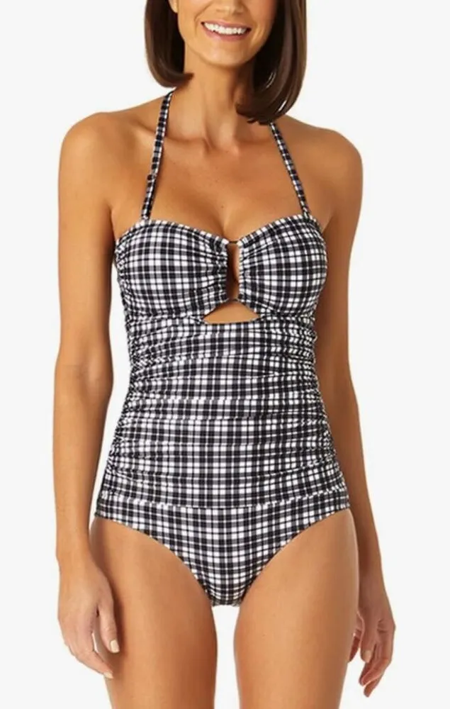 Anne Cole Bandeau Shirred Keyhole One Piece Swimsuit in Black & White Gingham Print - Size 16, new with tags! Precise plaid one piece swimsuit in a flirtatious bandeau style that has a keyhole cut out, removable halter strap, and wireless cups. Made of nylon and spandex. Shelf bra has wireless cups that have pockets for light, removable padding. Covered elastic underband provides extra bust support. Side ruching creates a draped front for a sleeker look. Shelf bra sides and back have covered elastic edges and microfiber lining for extra stability and support. Removable halter strap connects to swimsuit with goldtone metal S-hooks and adjusts with goldtone metal hardware. Upper sides have flexible boning to stabilize the fit. Moderate, "cheeky" rear coverage. Tags: Chic, Sexy, Black and White Swim, Gigham Swimsuit, One Piece, Classic Cut Swimsuit, Flattering Swimsuit, Pool Party, Vacation, One Piece Swimsuit, Feminine, Sexy Swimsuit, Long Line Swimsuit, 5456