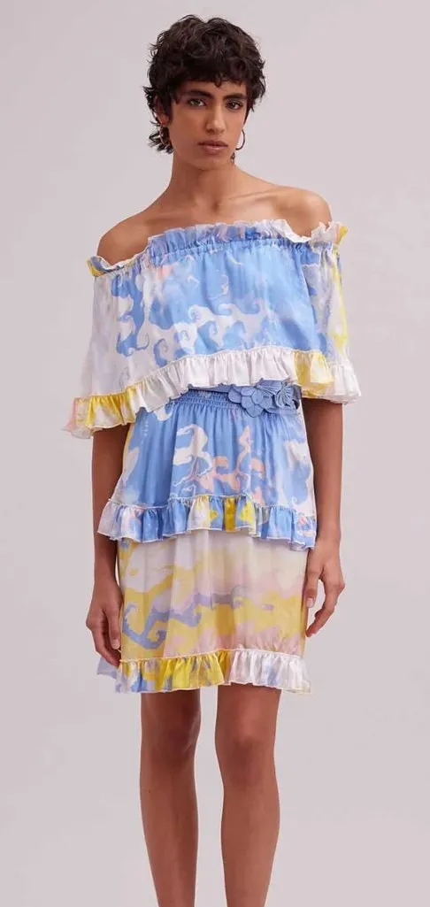 Size 36 which is a US 0-2 / XS / Measurements in photos Great condition! No major flaws but several small stains (shown in photos). Material: It is made from a soft, watercolor printed silk that drapes beautifully. Waist and Skirt: An elasticized waist releases to a double-tier skirt bottom. Hem: Each tier of the skirt features a mini ruffle hem. Occasion: It is designed as an ideal outfit for a beachside event or a holiday.