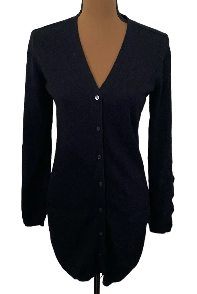Anne Fontaine Rachel black cardigan cutout sleeve longline cardigan Great used condition, size EU 38 or size US 6 Luxurious and very elegant, this longline cardigan features crochet elements with cutouts at sleeves to add visual interest to otherwise classy piece. V neck Longline silhouette Think knit Sweater crochet insets at sleeve s with cutouts Patch pockets at front Body: 76% viscose 24% polyester Sleeves: 50% wool 50% polyamide Measured flat: Pit to pit 17” Length 33.5” 17.7