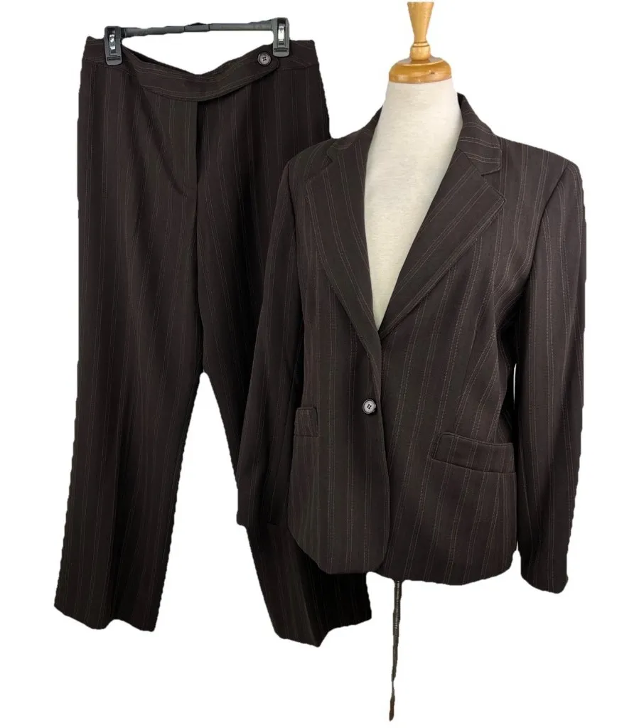 Dark brown with pinstripes, matching blazer and trousers Polyester / Rayon blend Dry Clean Trousers... Show more