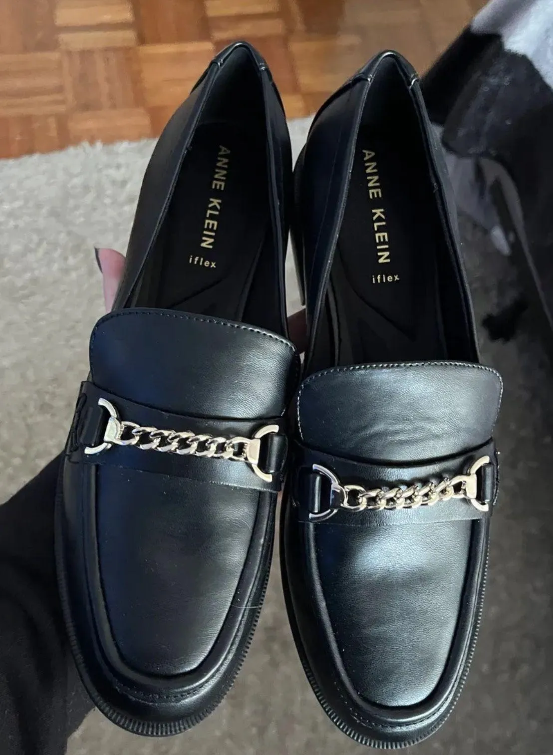 CONDITION : NEW WITHOUT TAGS Size 9 Anne Klein black loafers - Gold chain accent on both shoes - Su... Show more