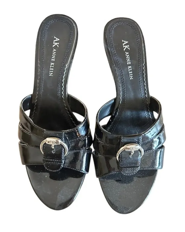 Classic Anne Klein slip-on kitten heels in sleek black patent leather. Designed with a silver-tone b... Show more