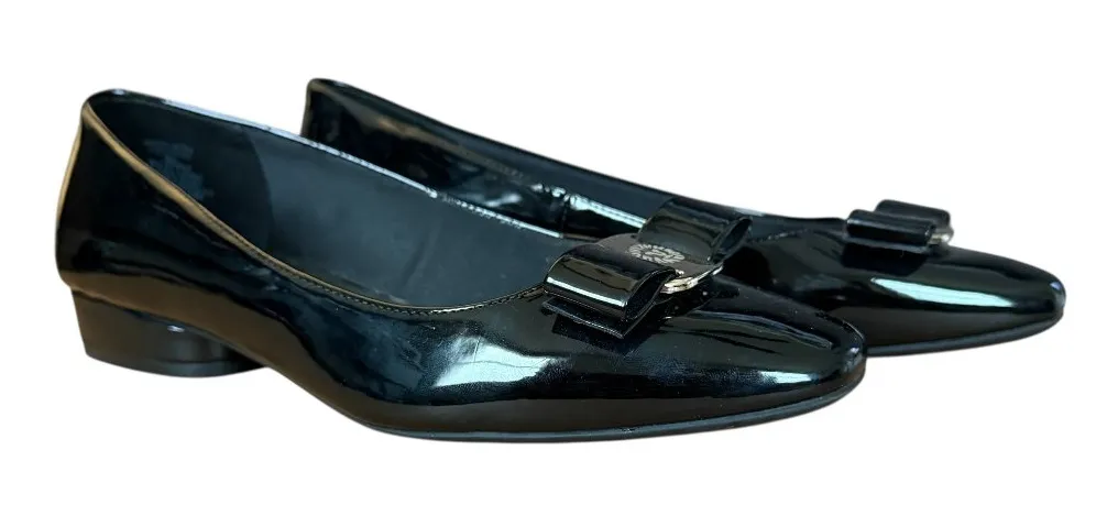 Women's Anne Klein black patent leather dress pump with front bow, size 6M. This has a 1" block hee... Show more