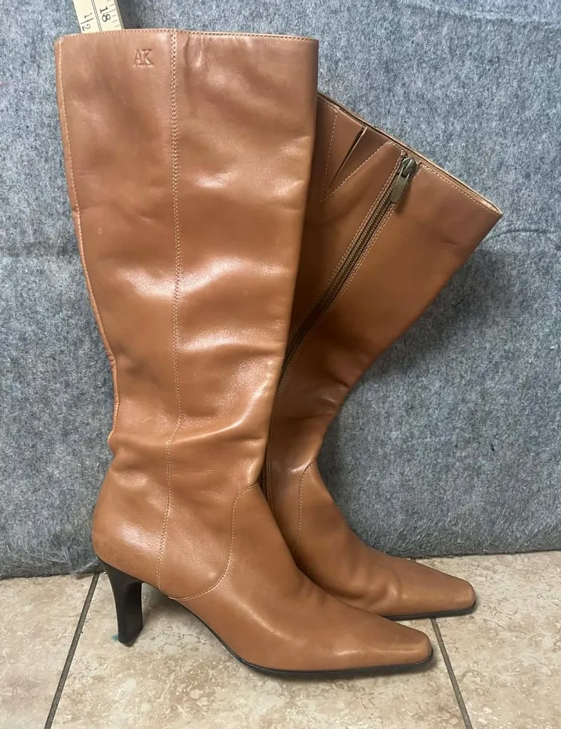 Chic tan heeled boots by Anne Klein. Sleek design with a stylish heel. Ideal for elevating any outfi... Show more