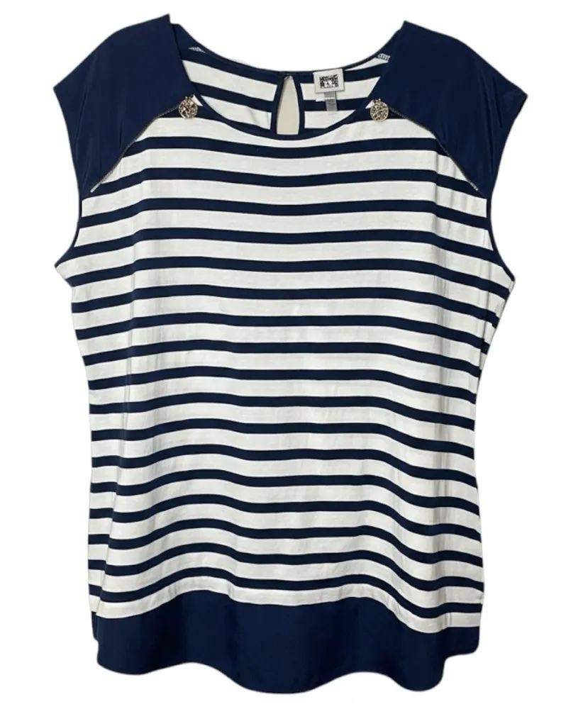 ANNE KLEIN WHITE & NAVY SAILOR STRIPED CAP-SLEEVE TOP WITH GOLD LOGO & ZIPPER DETAIL Size: 1X P2P:... Show more