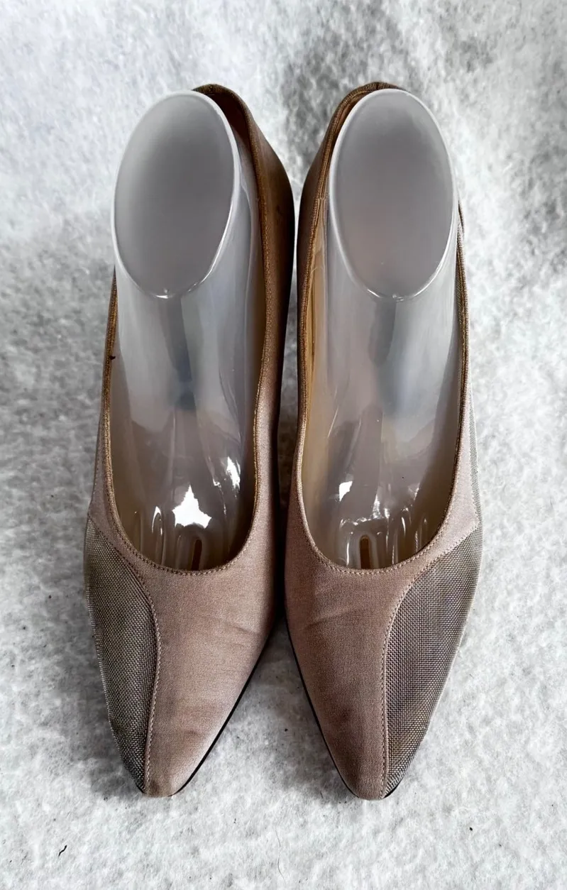 Keywords: Anne Klein Heels, Women's Size 6M Shoes, Beige Suede Heels, Mesh Panel Heels, Pointed Toe Stilettos, Italian Made Heels, Designer Heels, Dress Shoes, Evening Heels, Work Heels, Sophisticated Shoes, Elegant Footwear, Fashion Heels, Classic Heels