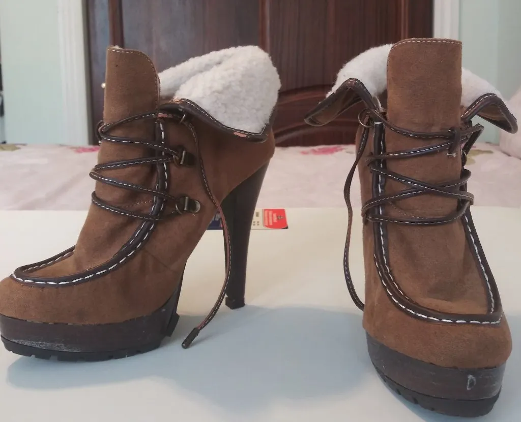 Super cute and cozy brown ankle boots with faux suede finish and soft white shearling-style lining. Lace-up front with fold-over cuff detail and contrast stitching. High stiletto heel with a chunky platform for extra comfort and style. Lace-up front with metal eyelets. Don't remember wearing these- but I don't remember so I won't promise, defiantly in a great condition as you can see in the soles picture attached. Pilling only on the stitching material I'm assuming duo to storage, and a small scuff on one shoe (see photos). These do not affect overall look or wear — still in great condition! Perfect for fall/winter looks — pair with jeans, tights, or a cute sweater dress!