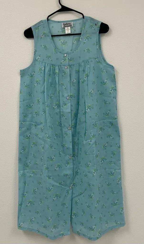 Vintage 80’s Summer nighty features a blue floral print, hip pockets and a full snap closure front. It is sleeveless with a scoop neckline and gathered bust detail. Made by Anthony Richards. Lightweight material. Size:Medium 55% cotton 45% polyester #cottagecore#gradmaFashion#vintage