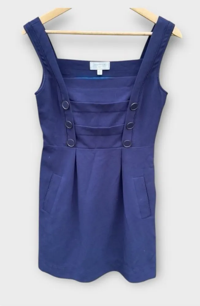 Moulinette Soeurs for Anthropologie •Adorable Nautical Sailor dress • Sleeveless with wide straps, navy blue with decorative gold & navy buttons, paneling on bodice, side pockets, rope piping details. • bright blue with lace lining • EUC Flat measurements: Pit to pit: 16.5” Waist: 14” Hips: 21” Length: 32” 1049