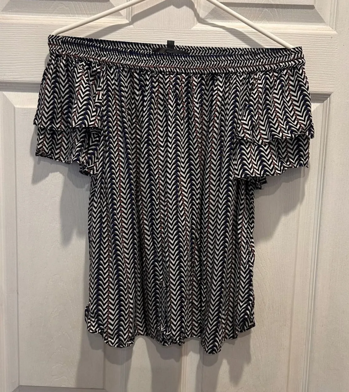 EUC. No flaws. Swingy and flutter sleeves. Off the shoulder. Type: Blouse Department: Women Style: Tunic Material: Polyester Blend Neckline: Off the Shoulder Sleeve Length: Short Sleeve Sleeve Type: Flutter Sleeve Pattern: Geometric Accents: Ruffle Features: Stretch Fit: Relaxed Fabric Type: Knit Occasion: Casual, Party/Cocktail Closure: Pullover Season: Summer, Spring, Fall Keywords: off shoulder, chevron print, ruffle sleeves, boho, casual, summer, lightweight, pullover, smocked neckline, zig zag, womens top, fashion, trendy