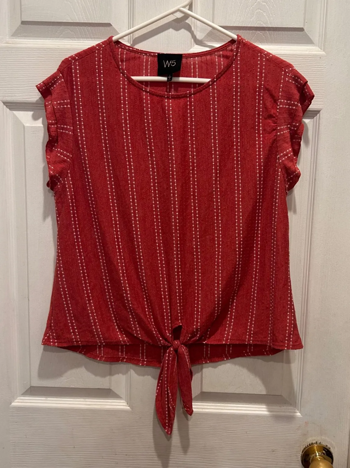 EUC. No flaws. UA to UA 20" Length 22" Measured flat and approximate Type: Blouse Department: Women Style: Cropped Material: Polyester, Rayon Neckline: Crew Neck Sleeve Length: Short Sleeve Sleeve Type: Cap Sleeve Pattern: Striped Accents: Bow Theme: Casual Features: Lightweight, Adjustable Fit: Regular Fabric Type: Knit Occasion: Casual Closure: Tie Season: Summer, Spring Keywords: W5, red top, striped shirt, tie front, cap sleeve, casual, women's fashion, summer top, lightweight, basic, everyday wear, made in usa