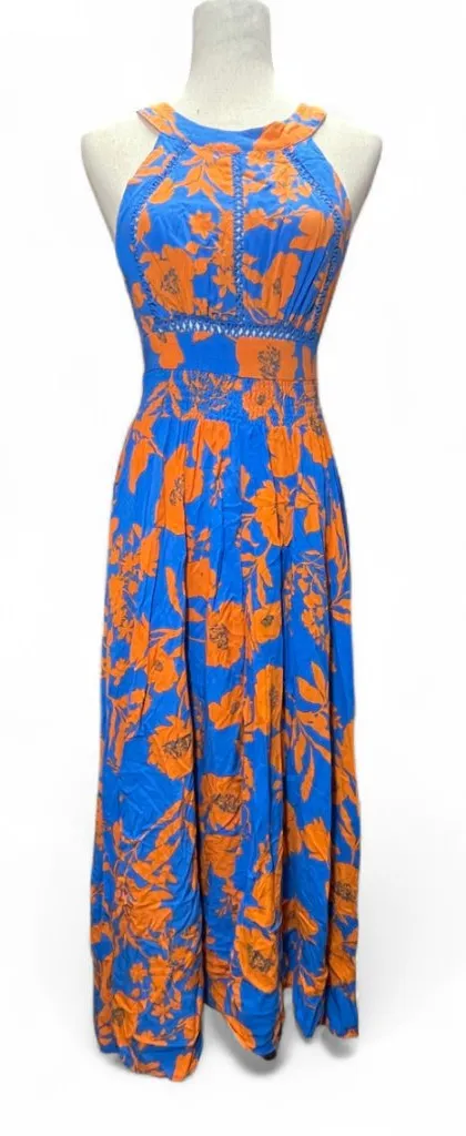 - minor flaws, see photos - front slit Flat lay measurements (approximate in inches): - length: 48" - pit to pit: 11' - waist: 10" (smocked and stretchy) Great preloved condition, minor flaws. See photos for details and condition. Exact item pictured will be shipped. boho, maxi, resortwear, euro girl, colorful, floral, wedding guest, party, backless, sexy, high neck