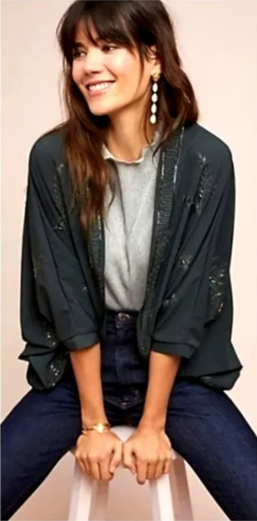 Elegant black kimono cardigan with intricate embroidery. Perfect for layering. sku 317