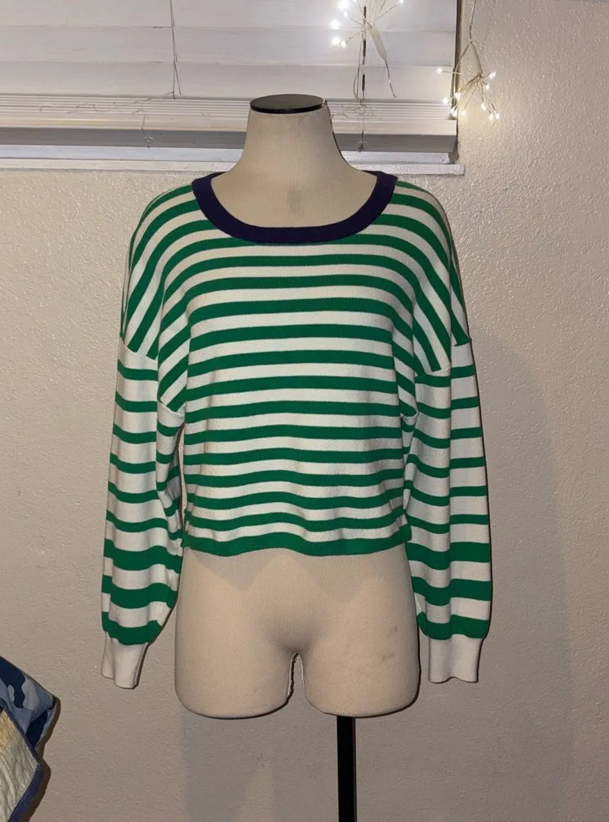 ANTHRO Daily Practice Green White Stripe Navy Round Neck Top $98 EUC M •DETAILS: *Chic. Comfortable... Show more