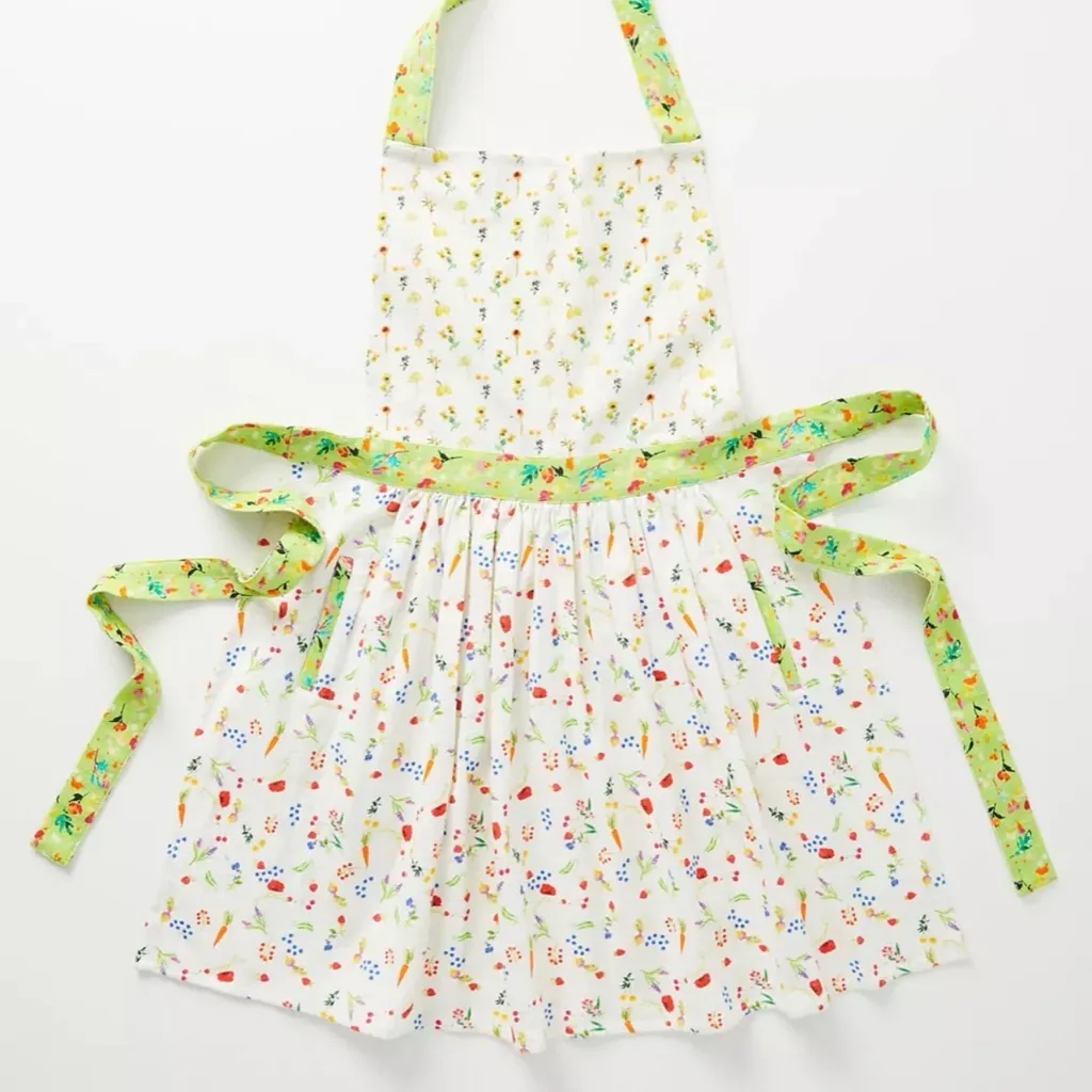 Charming floral apron with green ties. Perfect for cooking and baking.