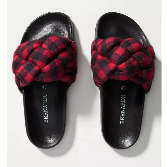 ANTHROPOLOGIE BERNARDO Braided Plaid Puffy Band Comfort Slides, Size 7 New with tags! Box included Red and black checkered braided band Heel is less than 1 inch Open toe Polyurethane upper, insole Rubber sole Slip-on styling Imported, made in Brazil