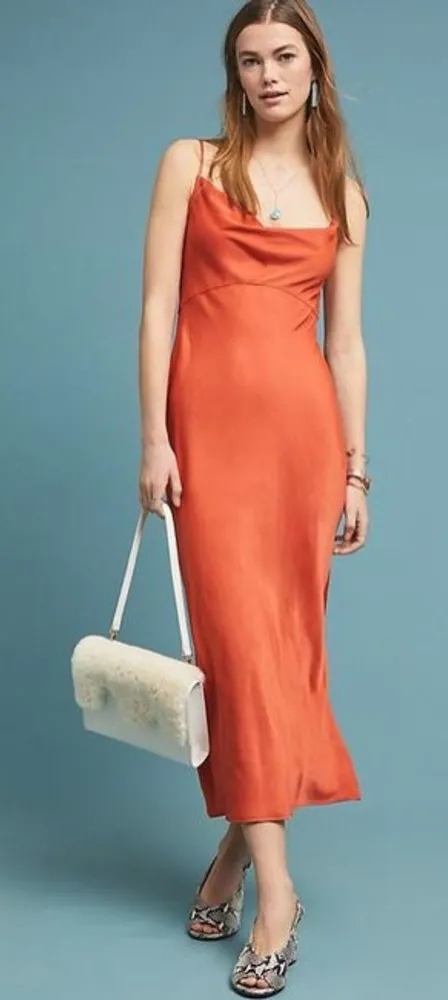 Great, preowned condition, no found flaws This elegant orange slip dress is perfect for any occasio... Show more