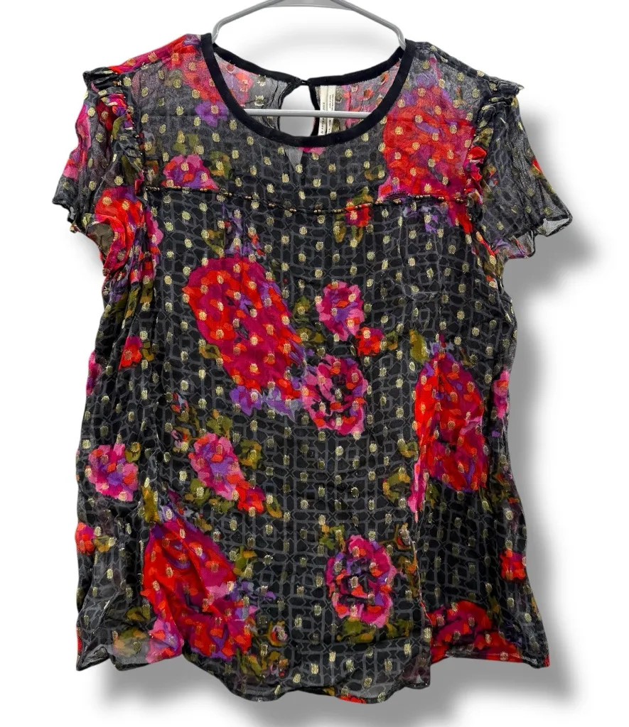 Anthropologie Black Multicolor Floral Polka Dot Metallic Short Sleeve Top With its eye-catching com... Show more