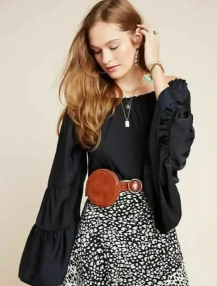 - Style #OB1049850 - -Lightweight fabrics; body is super soft modal blend, -Off shoulder w/ ruffled hem, -Dramatic tiered bell sleeves, -Relaxed, slightly cropped fit body, -Great condition, only very mild wear. Pullover styling. Tiered bell sleeves. An off-the-shoulder silhouette and dramatic, exaggerated sleeves add a sophisticated finish to this billowy, versatile top. This simple blouse is both boho and chic - perfect for festivals and summertime wear! Dress up or down, this top is the perfect addition to your closet. Tags - boho, cottage, coastal grandma, resortwear, fairy, girly style, preppy fashion, hippie, western vibe, European, Quiet luxury, granola girl aesthetic, prairiecore, lagenlook, crunchy mom, sustainable, academic, fall, distressed, layered look, vintage-inspired, Y2K fashion, bohemian style, outdoor activities, nature-inspired, minimalist, unassuming.
