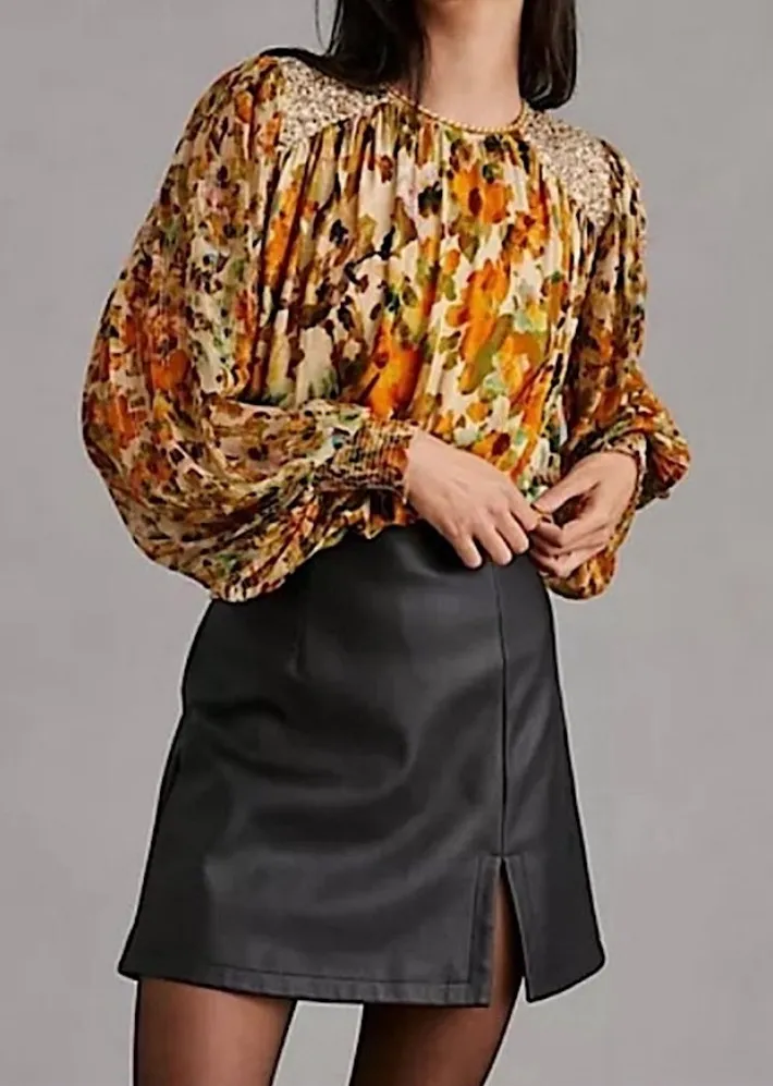 Anthropologie Blank London Sequin Sheer Metallic Puff Sleeve Floral Blouse XS. This versatile, sequi... Show more