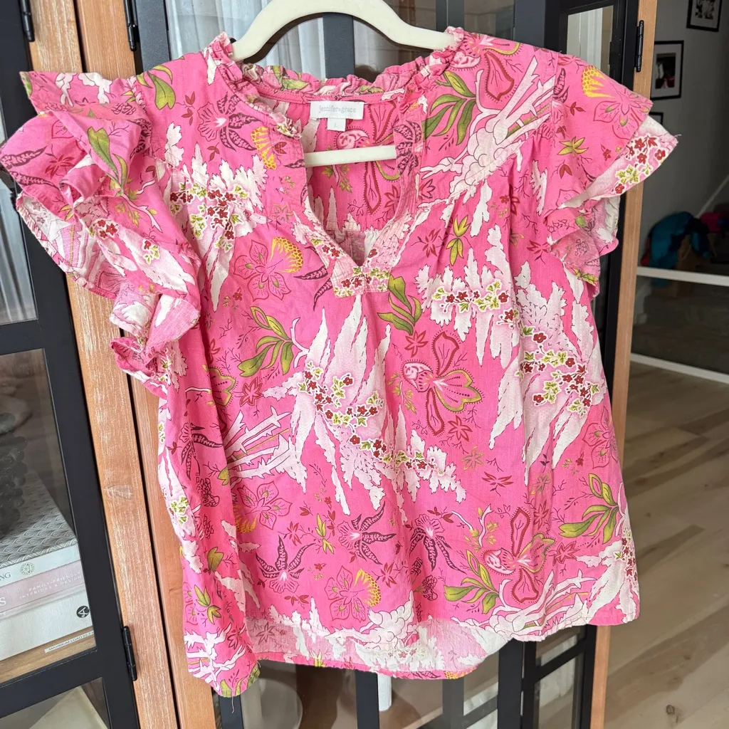 Size large Bright pink floral lei print Short ruffle sleeve Splice neckline Similar to ulla’s blouse