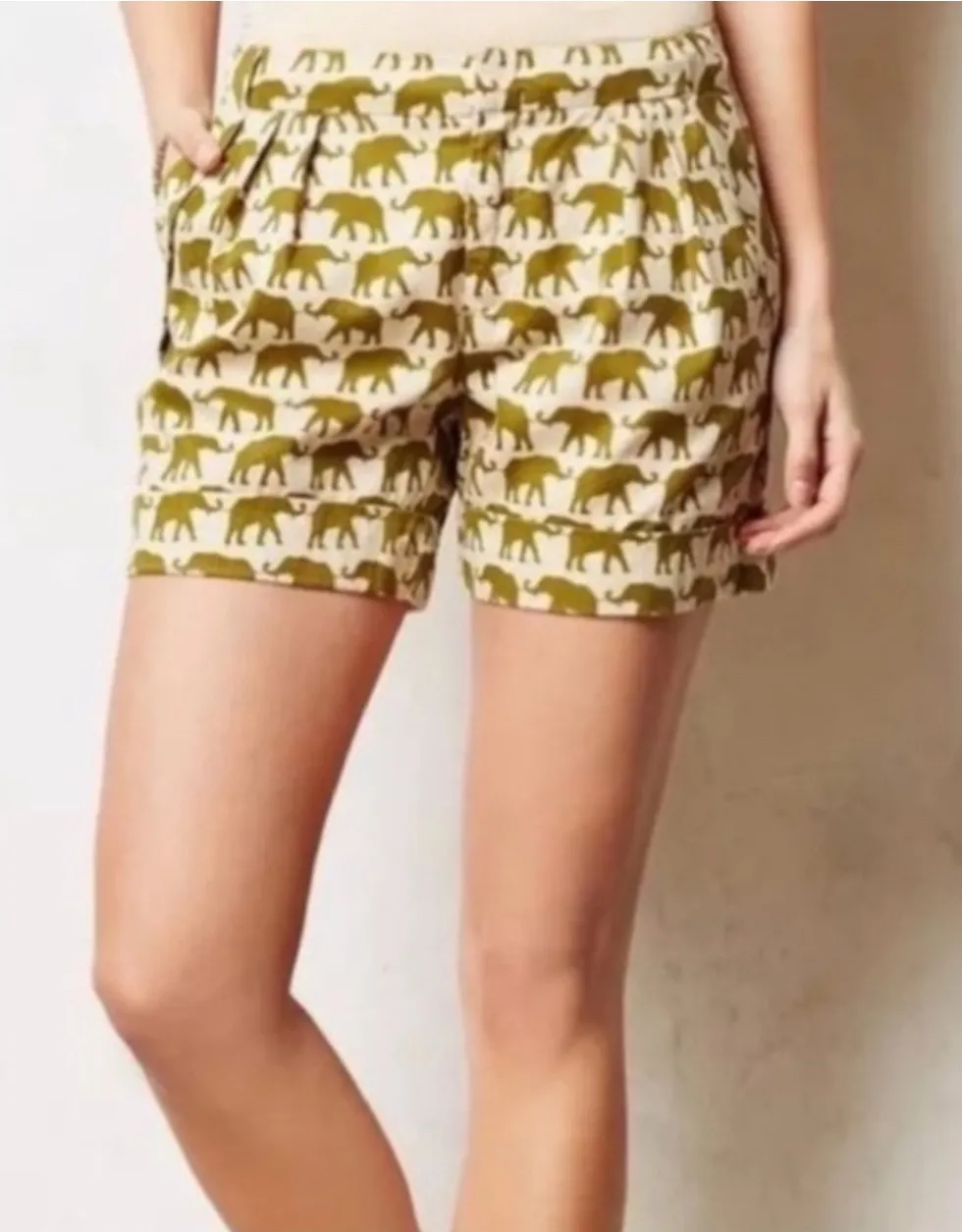 Pleated shorts featuring an allover olive green elephant print on a beige background. These shorts offer a stylish and playful design with functional pockets and a comfortable fit. The waistband features belt loops and a button and zipper closure for adjustability. The back of the shorts includes two welt pockets. Measurements: • Waist: 14 inches • Inseam: 3 inches • Rise: 9 inches Style: Paperbag Department: Women Fabric Type: Twill Material: Tencel Blend, Cotton Blend, Acetate Trim Theme: Bohemian, Designer, Animal Print Occasion: Casual, Travel Accents: Pleated, Button, Zipper Pattern: Animal Print Features: Pockets, Belted, Adjustable Waist Front Type: Pleated Keywords: Cartonnier shorts, Women's shorts, Elephant print shorts, Pleated shorts, High rise shorts, Casual shorts, Summer fashion, Designer shorts, Olive green shorts, Beige shorts, Size 4 shorts, Boho shorts, Vacation wear