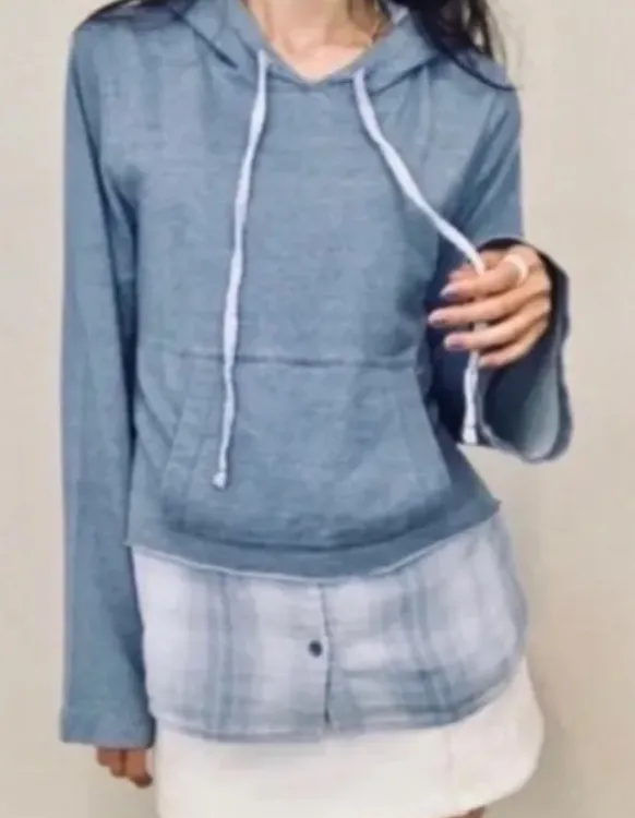 Anthropologie Cloth & Stone 2 fer Chambray Plaid Faux Layered Hoodie Tie on Front Built in Plaid Un... Show more