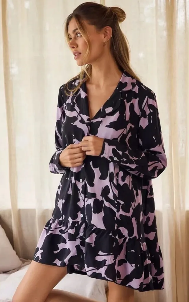 This lilac purple and black printed floral dress is in good condition with no flaws! Button front tu... Show more