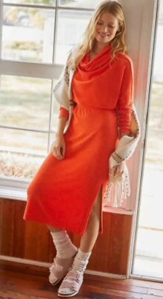 This Anthropologie Daily Practice dress is a vibrant orange knit midi dress with a cowl neck and lon... Show more
