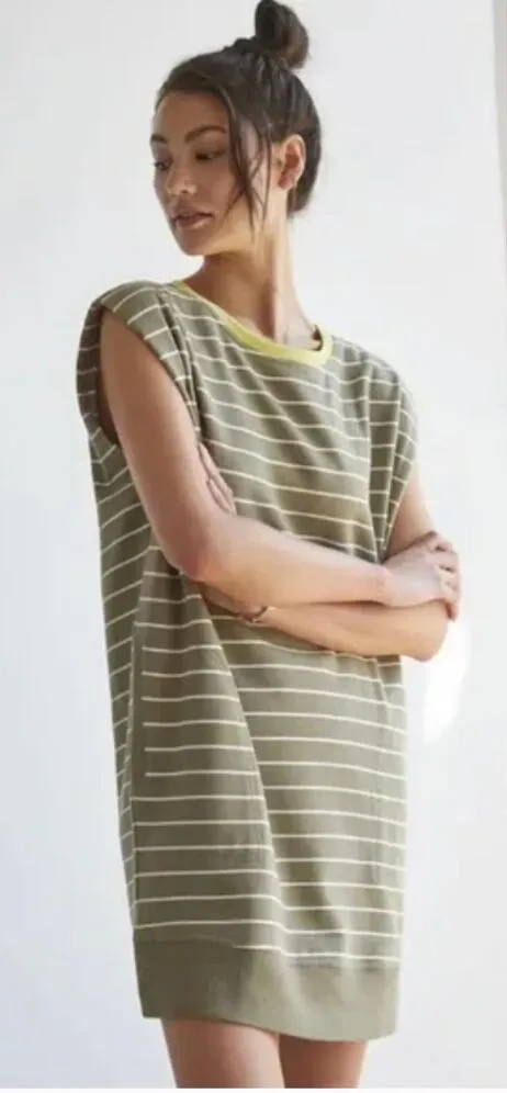 Anthropologie Daily Practice Striped Light Fleece Tee Dress in Olive Green and Neon Green. Soft li... Show more