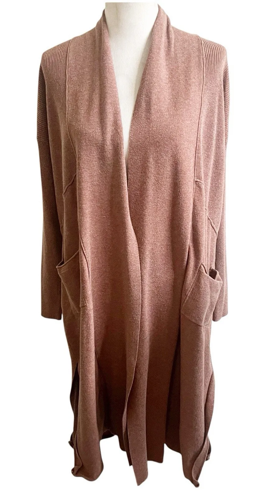 The Anthropologie Daily Practice Wrap Longline Cardigan in Brown is a stylish and versatile sweater perfect for a variety of occasions. This tight-knit cardigan features a solid pattern with a bohemian theme, making it a classic yet trendy addition to any wardrobe. With its open front neckline and raglan sleeves, this cardigan is both comfortable and fashionable. The brown color and polyester and viscose material make it easy to care for with a hand wash. Complete with pockets and a size small, this cardigan is ideal for casual outings, business meetings, or even a party. Excellent used condition no holes or stains 22” pit to pit ; 41” length 48% recycled; 26% viscose ; 19% poly; 9% nylon #lounge#relaxed#yoga#athliesure