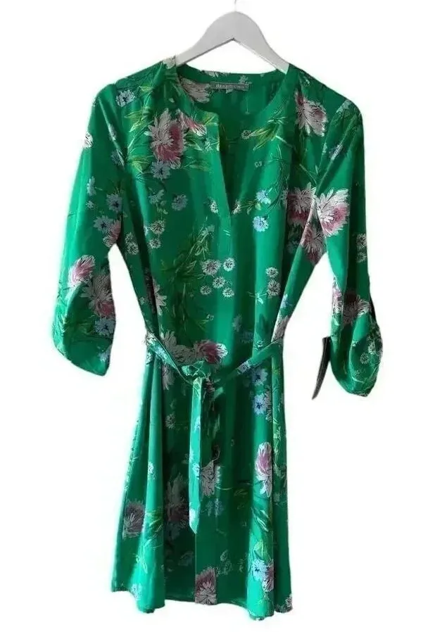 Anthropologie Danielrainn Mini Dress Womens Green Floral Print 3/4 Sleeve Tie Waist SZ M #2194 New w... Show more