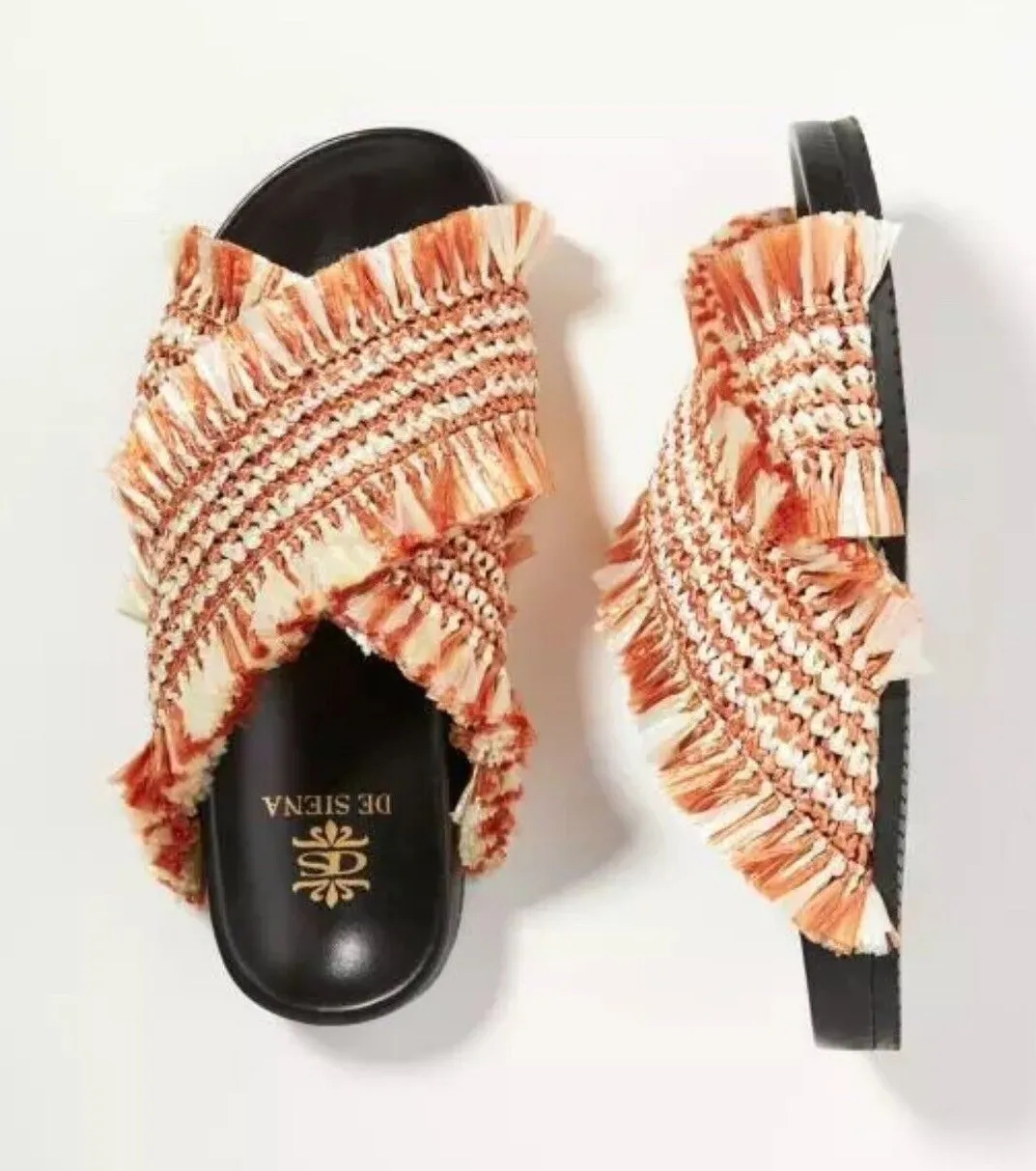 Elevate your summer style with these Anthropologie De Siena Criss-Cross Fringe Slide Sandals in Brow... Show more
