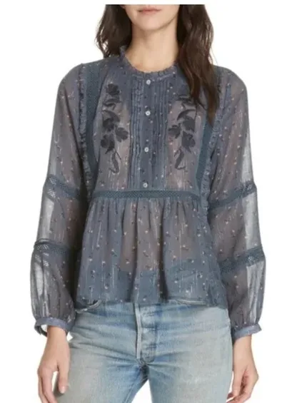Dolan Lauren Embroidered Edwardian Blouse Blue Gray Floral Boho Long Sleeve XS. Sold At Anthropologi... Show more