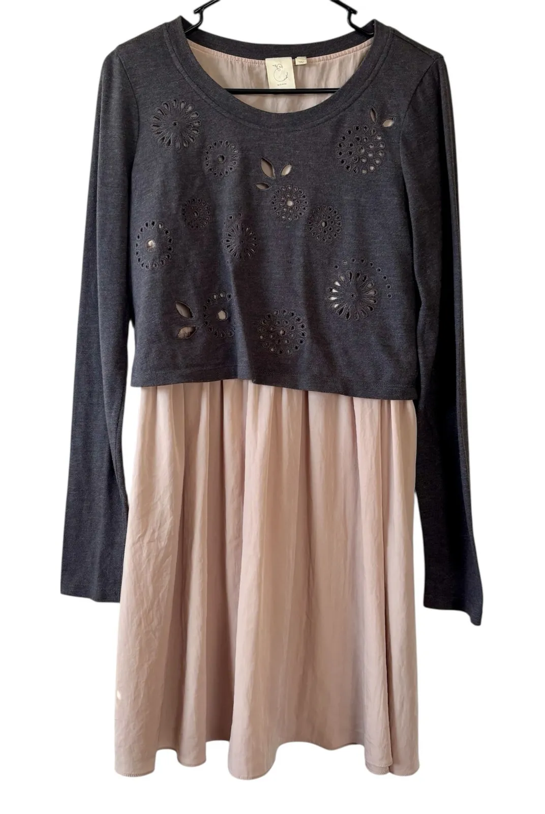 Features: Anthropologie E By Eloise Long Sleeve Overlay Sweater Dress; blush and gray dress has a lightweight sweater with cutouts over the top of an empire waist slip skirt. Size: medium Condition: excellent gifts for her, casual, chic, relaxed, stylish, trendy, feminine, twee, preppy, layered, coquette, romantic, soft girl, balletcore