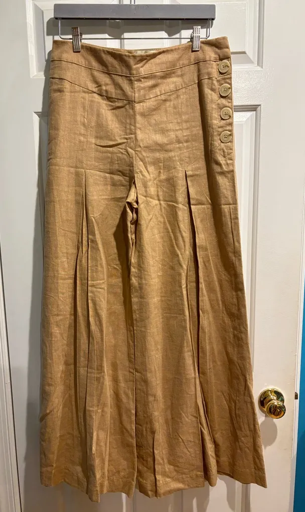 Beautiful wide leg pants with front pleats and buttons detail on the side. Size 12. New with tags.